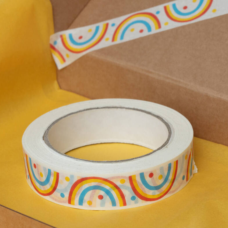 Add a splash of color to your gift wrapping, parcels, and crafts with this vibrant rainbow paper tape.