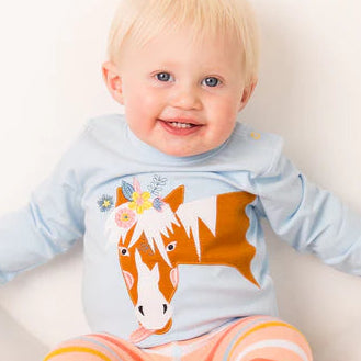 This light blue top showcases a charming horse print on the front, bringing a sense of fun and whimsy to this cute piece of clothing.
