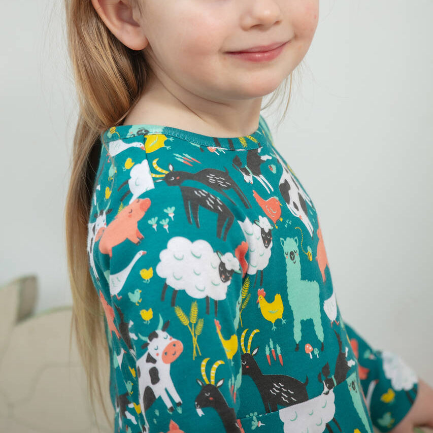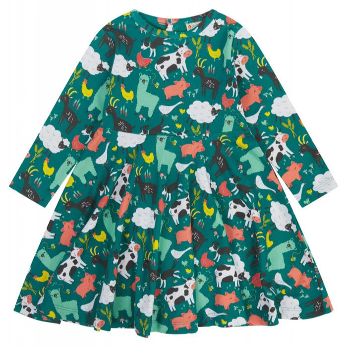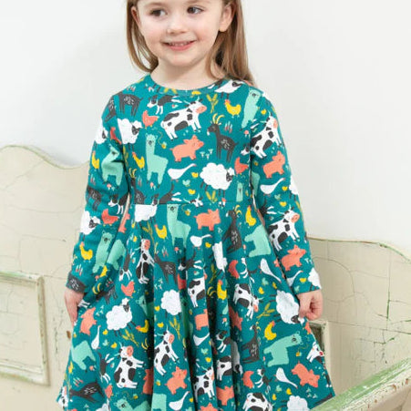 Introducing Buckden Farm, a vibrant new print bursting with color and fun! Your little one will love swirling and twirling in this gorgeous teal green long-sleeve skater dress, featuring bold farmyard animals—cows, pigs, sheep, and more. 🐮🐷🐑