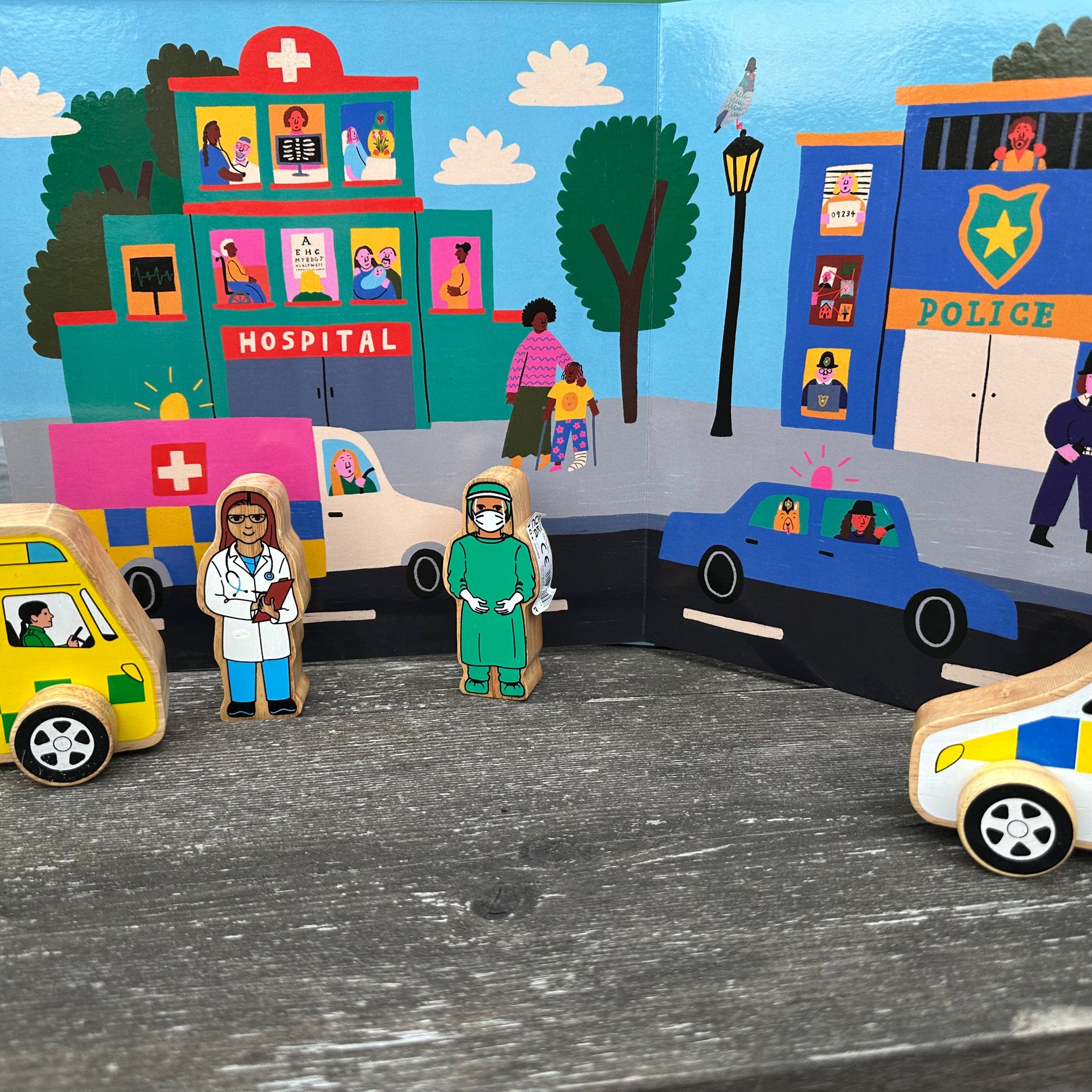 Each play card easily stands up and slots together, making it simple for children to create their own layouts. Designed and illustrated by artist Ella Kasperowicz, every piece is bursting with detail and personality. Familiar landmarks like the school, police station, park, hospital, fire station, shops, ice cream parlour, pizzeria, museum, garage, and train station are brought to life with vibrant colours and playful illustrations. Even the little extras — a pub, salon, and cosy houses — add charm and spark imaginative role play.