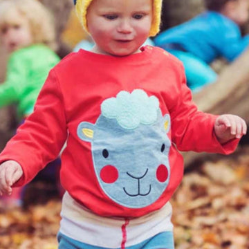 Let your little one stand out from the herd with this vibrant red top, featuring an adorable grey jersey-faced sheep with a fabulous fleece quiff!