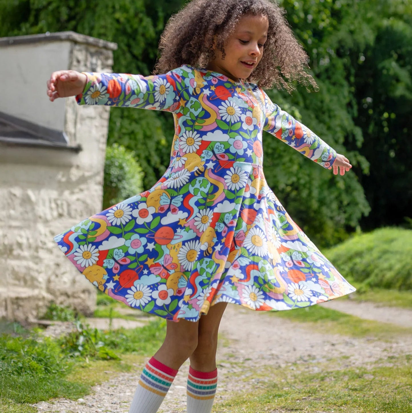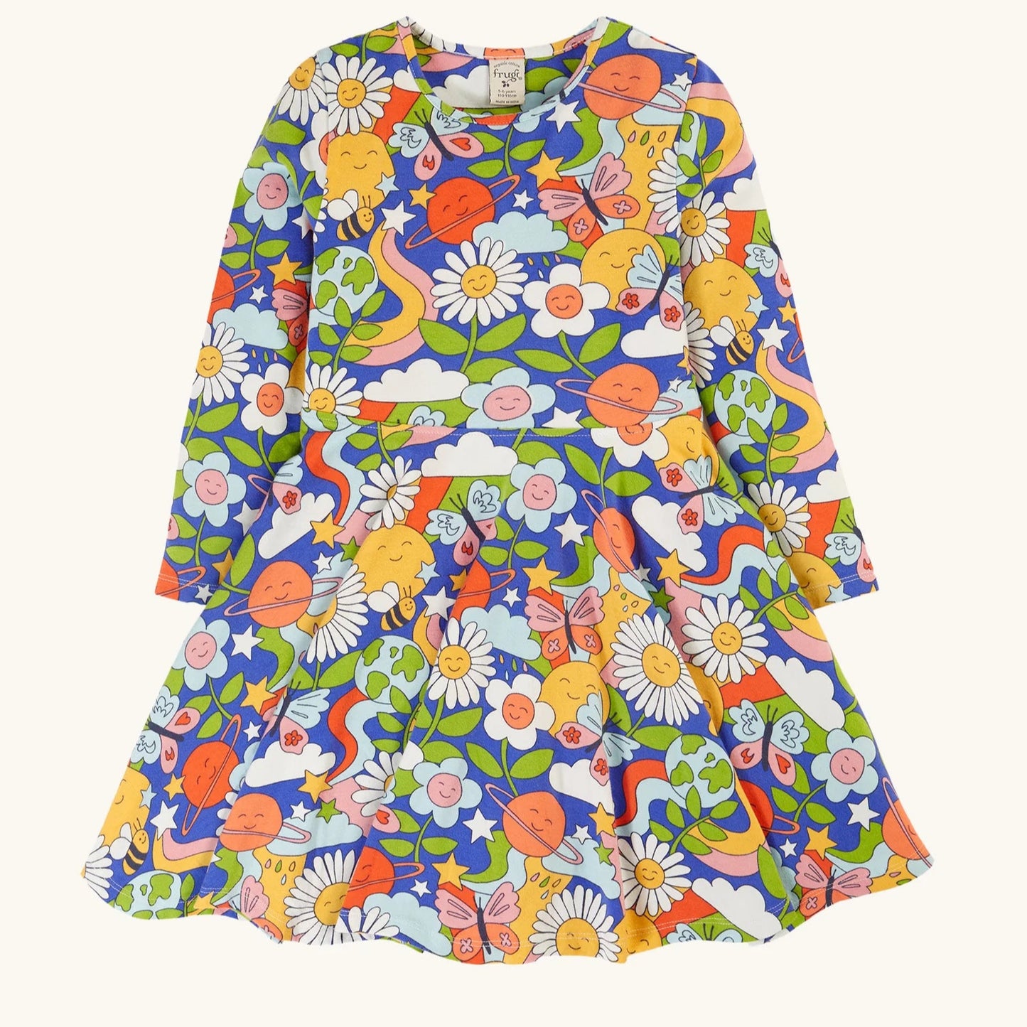 ✔ Made from 95% Organic Cotton Jersey & 5% Elastane for a soft, flexible fit ✔ Kind to sensitive skin – gentle, snuggly, and breathable ✔ Fun & vibrant Frugi prints and designs ✔ Long-sleeved for extra warmth and comfort ✔ Full circular skirt for ultimate twirling fun