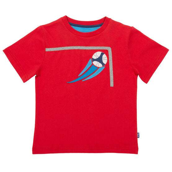 Did you know that 'top bins' is the phrase used when a goal is scored in one of the top corners of the net. (Not everyone at Kite knew this when we designed this t-shirt!). Of course your little one might be completely au fait with football phrases and ready to be wearing a fantastic t-shirt that reflects the name in the design! In a vibrant red with goal-scoring appliqué design, this top captures all the action as you make the winning shot!